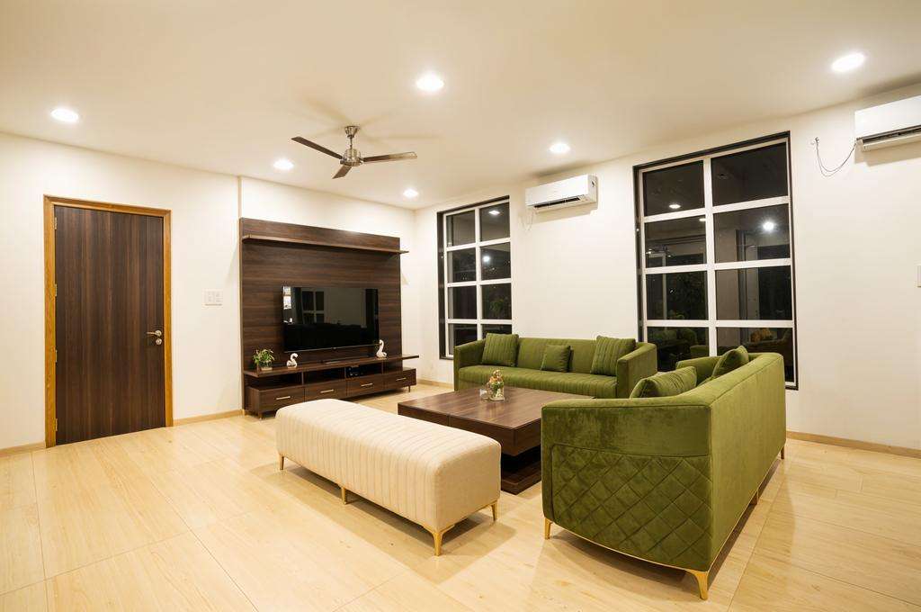 The living room features long windows that flood the space with natural light enhancing its airy ambiance. Aesthetic sofas provide a comfortable seating area, complemented by a stylish TV unit and a wooden table that adds a touch of warmth and elegance to the room.