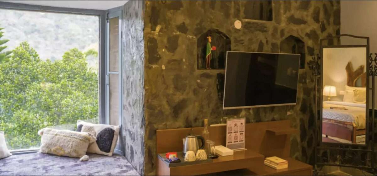 One king-sized bed | Ensuite bathroom | 200 sq.ft | AC | Fan | Heater | 43“ TV | Chairs & a table | Wardrobe space | Mini fridge | Classy standing mirror | Glass doors with outdoor access | Stone wall cladding | Ceiling spotlights & night lamps | Cosy window seating with cushions & views | Hill view | Located on the ground floor