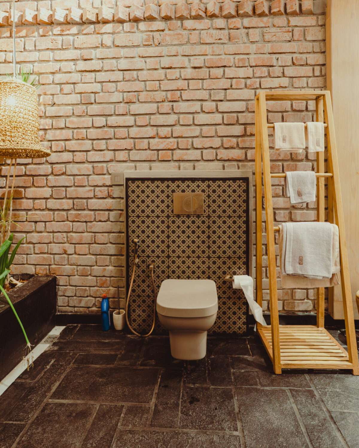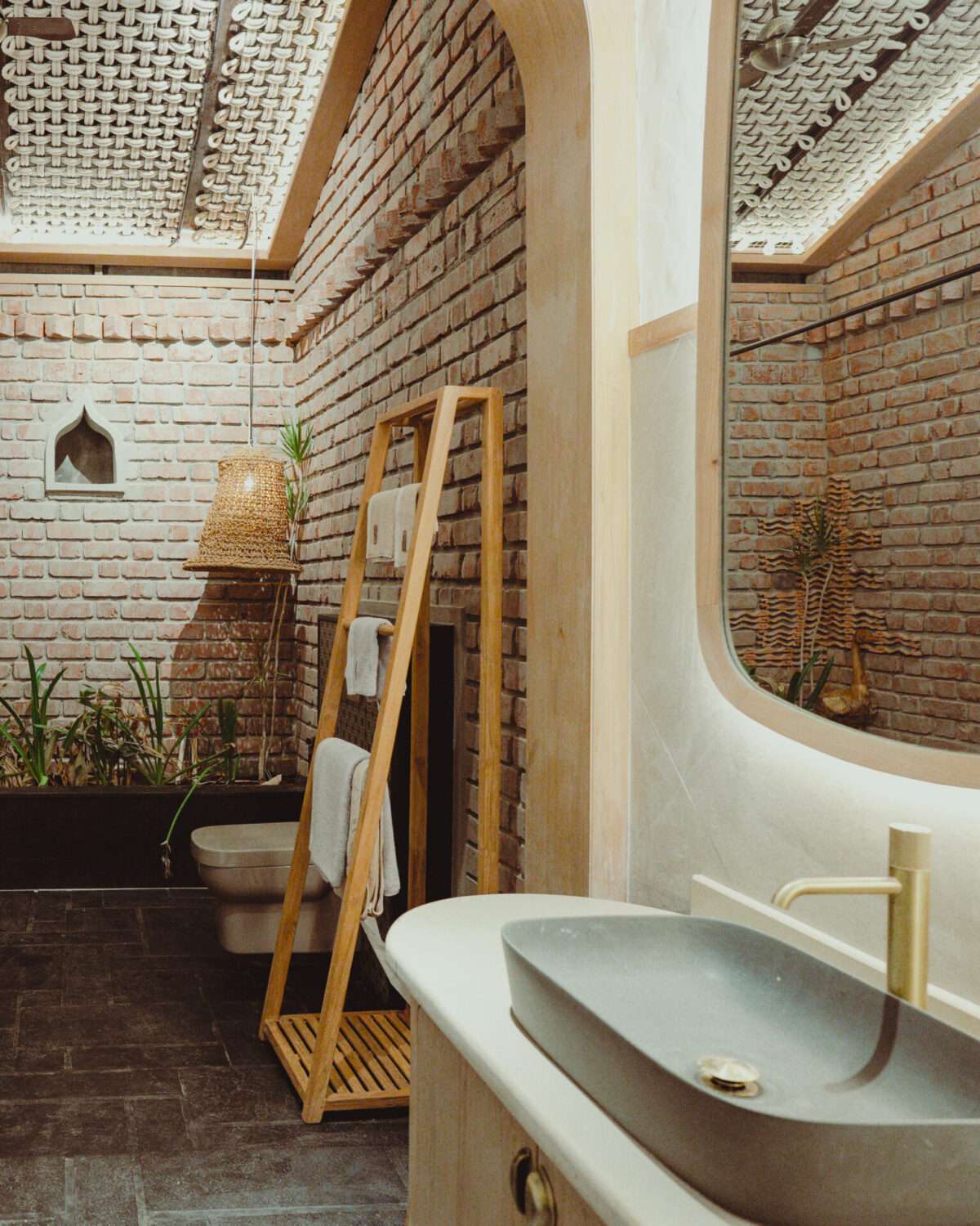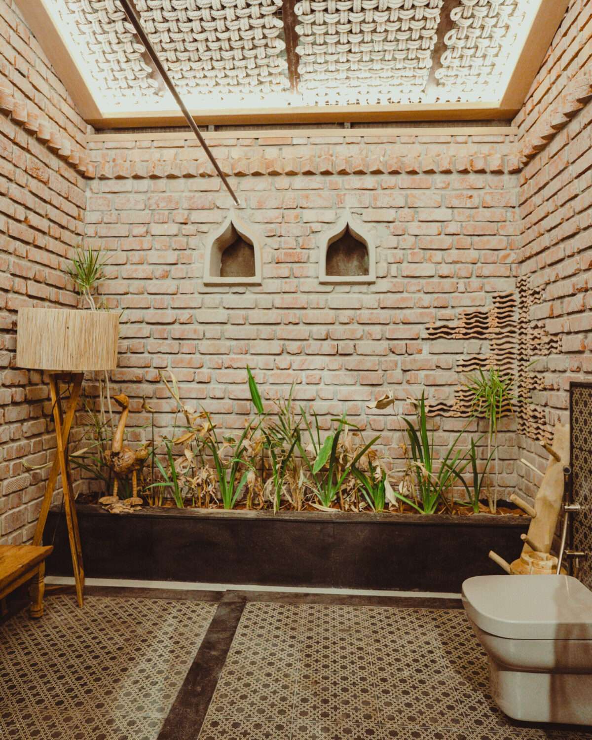 Grey-stoned bathtub | Shower, geyser and hand bidet spray | Hair dryer | Organic toiletries and towels | Western commode | Exposed brick walls | Ceiling fan | Mirror | Long wooden bench | Indoor plants | Jute ceiling with skylight | Night lamp