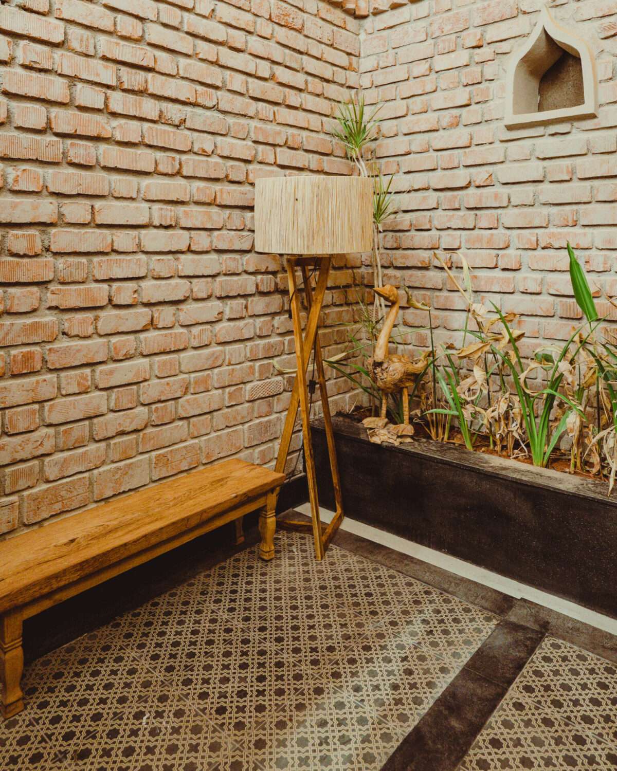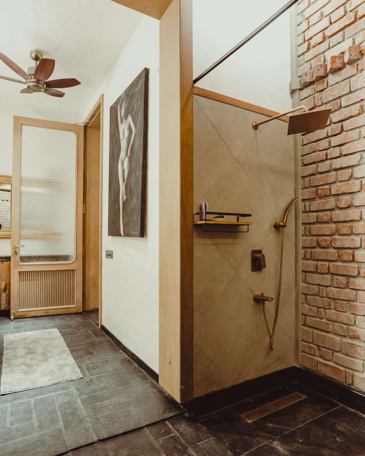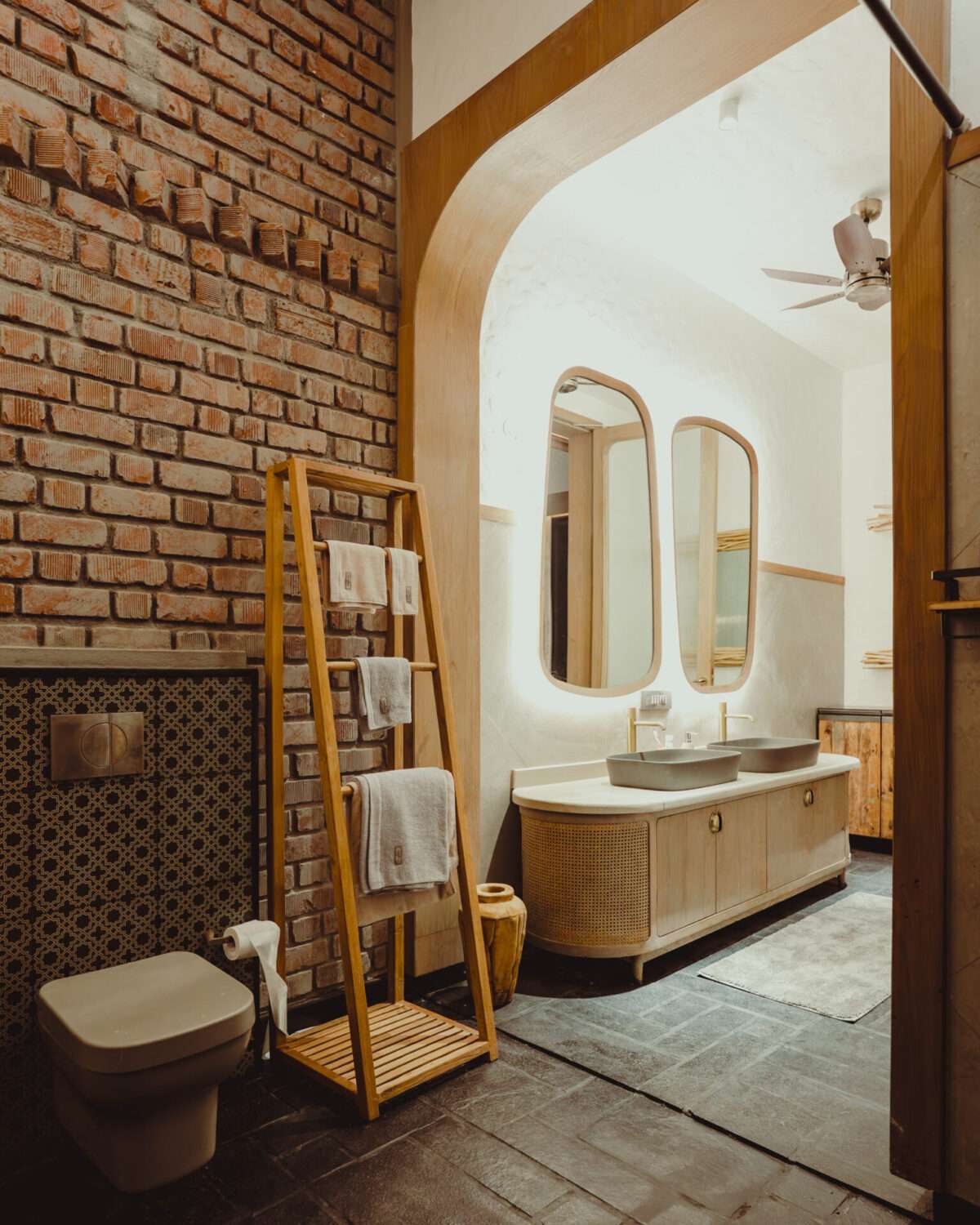 Grey-stoned bathtub | Shower, geyser and hand bidet spray | Hair dryer | Organic toiletries and towels | Western commode | Exposed brick walls | Ceiling fan | Mirror | Long wooden bench | Indoor plants | Jute ceiling with skylight | Night lamp