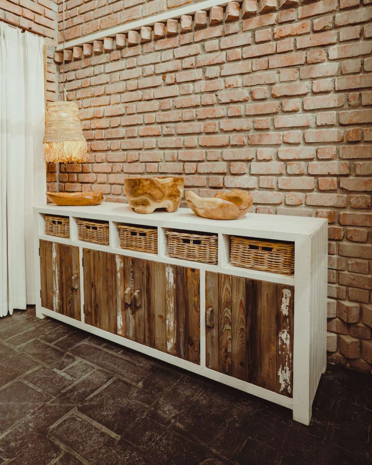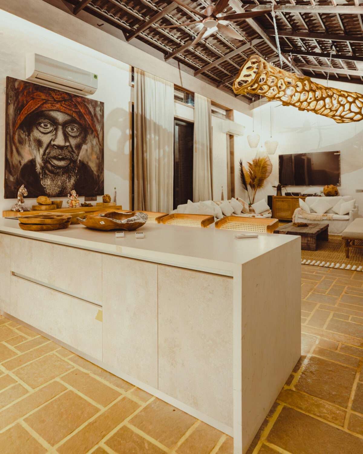 Bar island & countertop | Wooden stools | Hanging lights made of natural fibres | Exposed walls | Sink & wooden decorative items | Warm lighting | Wall art above the wooden cabinet | Attic-style wood-beam ceiling | Antique clock & jute furnishing