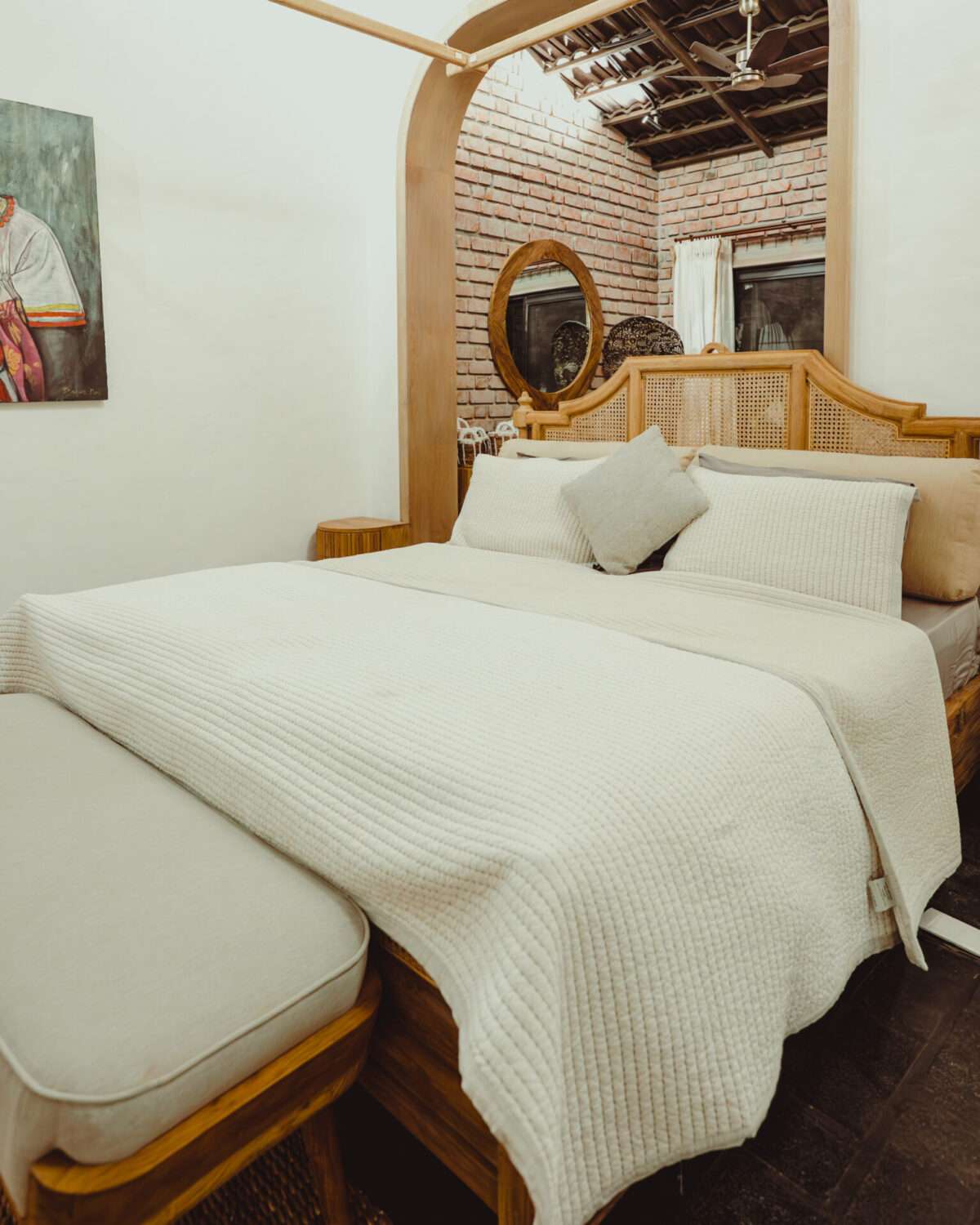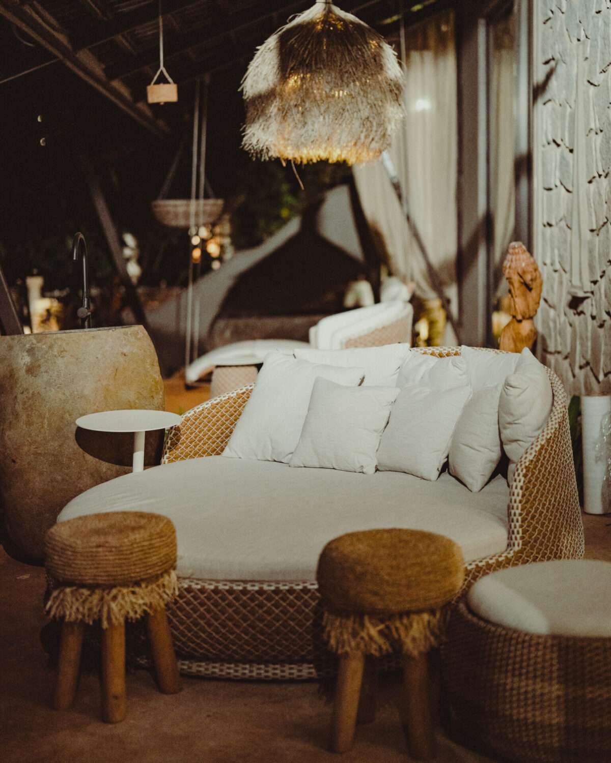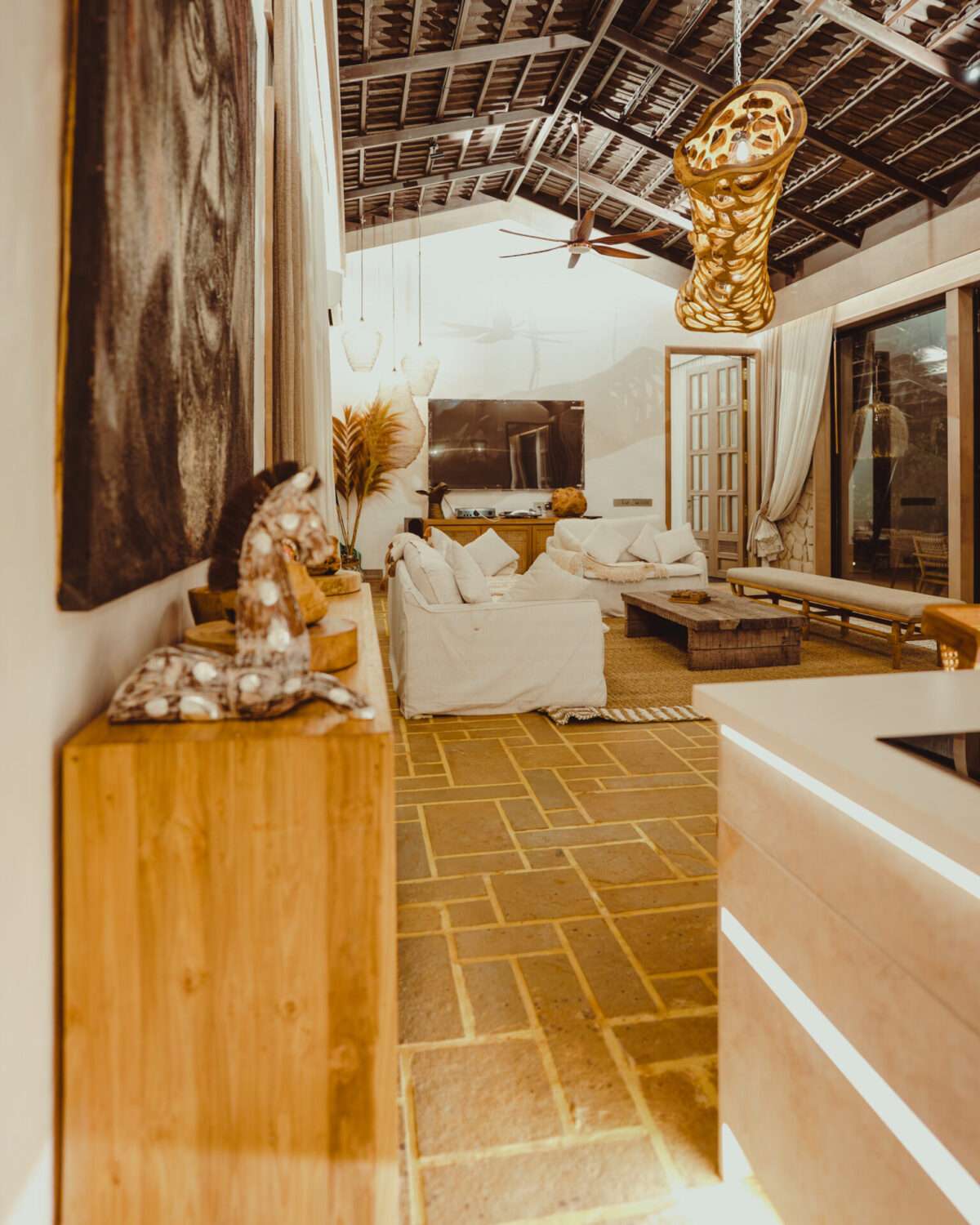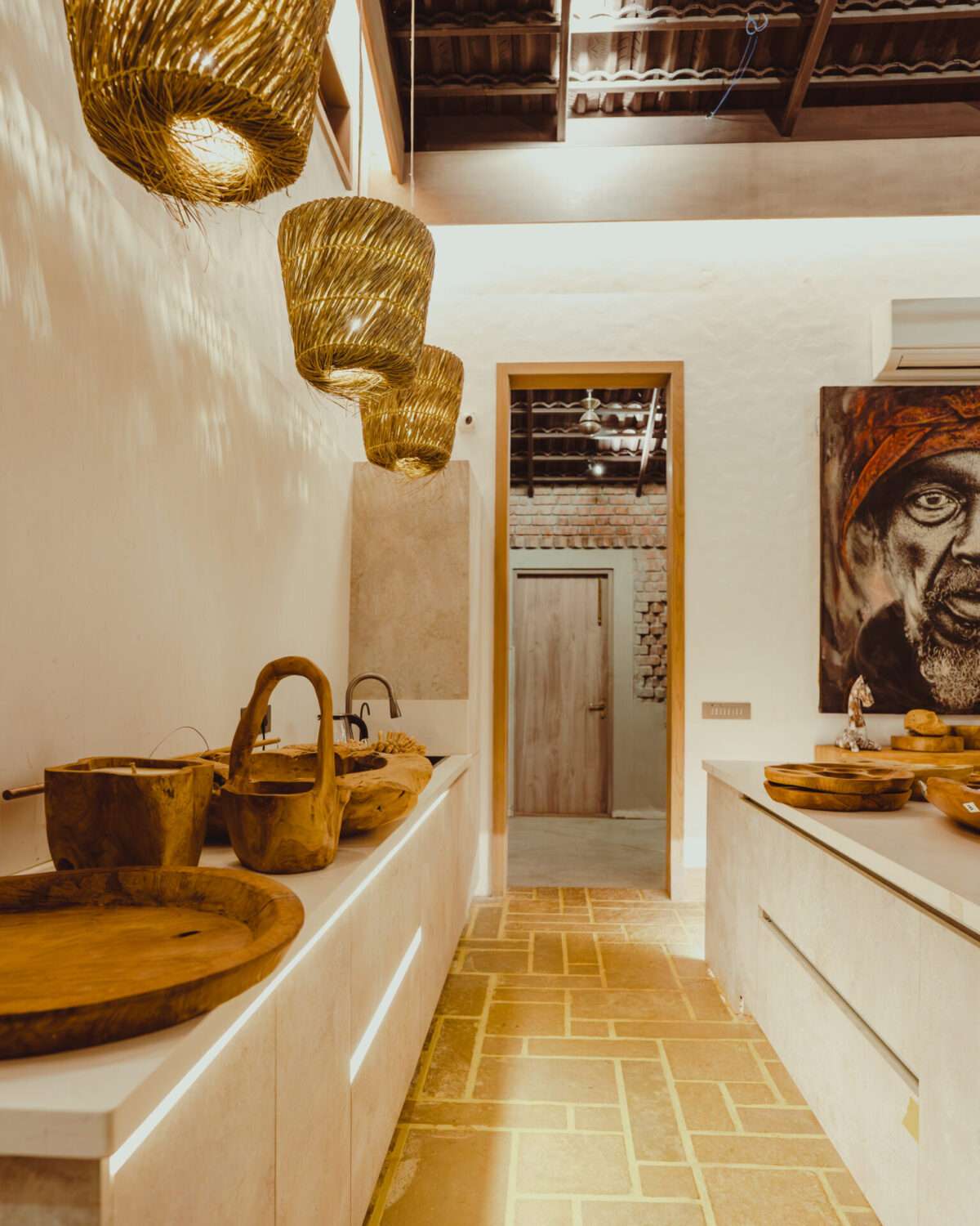 Each villa features airy bedrooms with handcrafted wooden beds beneath exposed wood-beamed ceilings, ensuite bathrooms with grey-stone bathtubs, and a curated selection of organic toiletries. Brick-lined living spaces and bar corners blend rustic charm with coastal sophistication, while kitchens come fully equipped for intimate meals or leisurely brunches under the glow of cane pendant lighting. Patios extend into the outdoors, framed by tropical plantings, artisanal sculptures, and boho-style seating nooks- inviting both conversation and stillness.