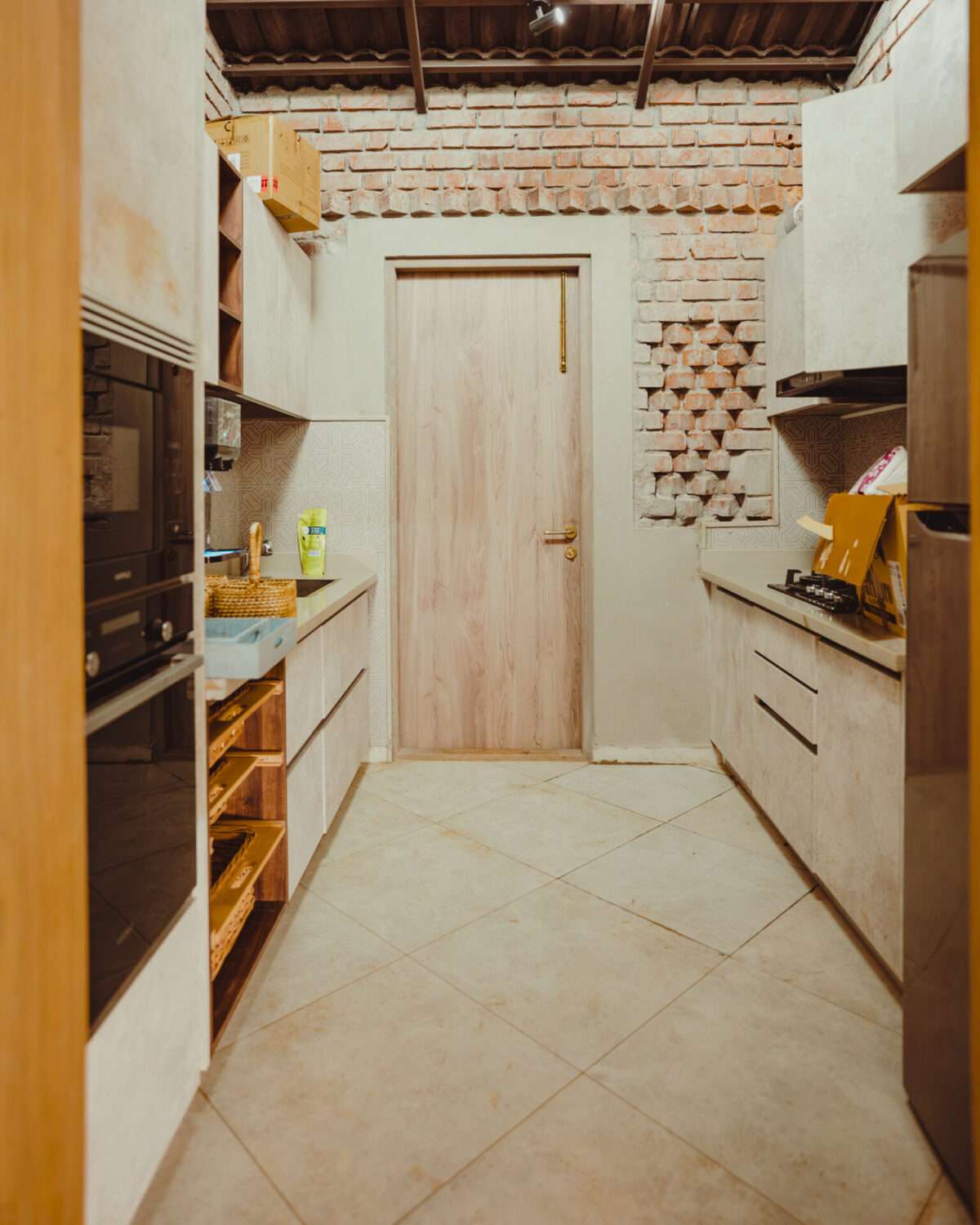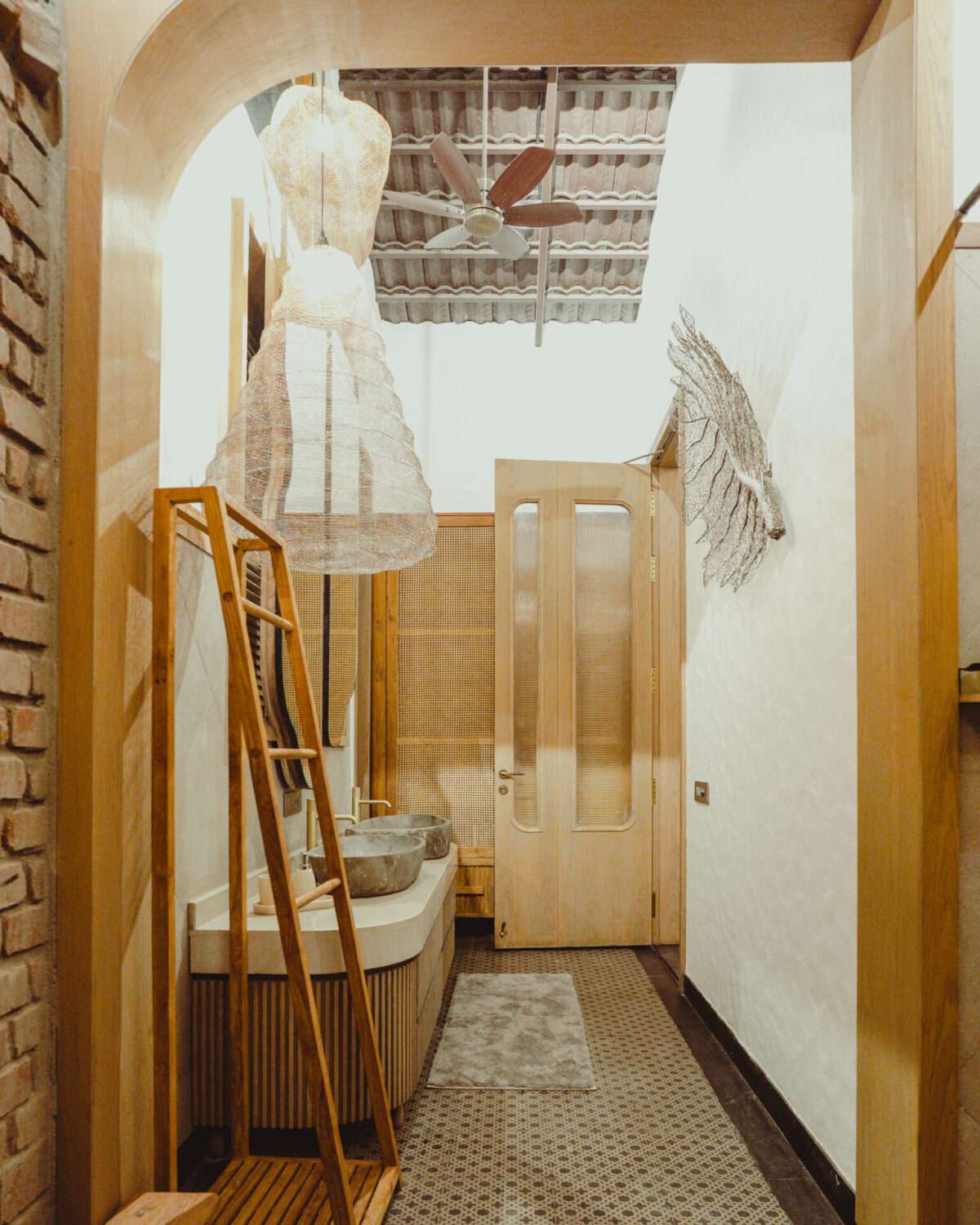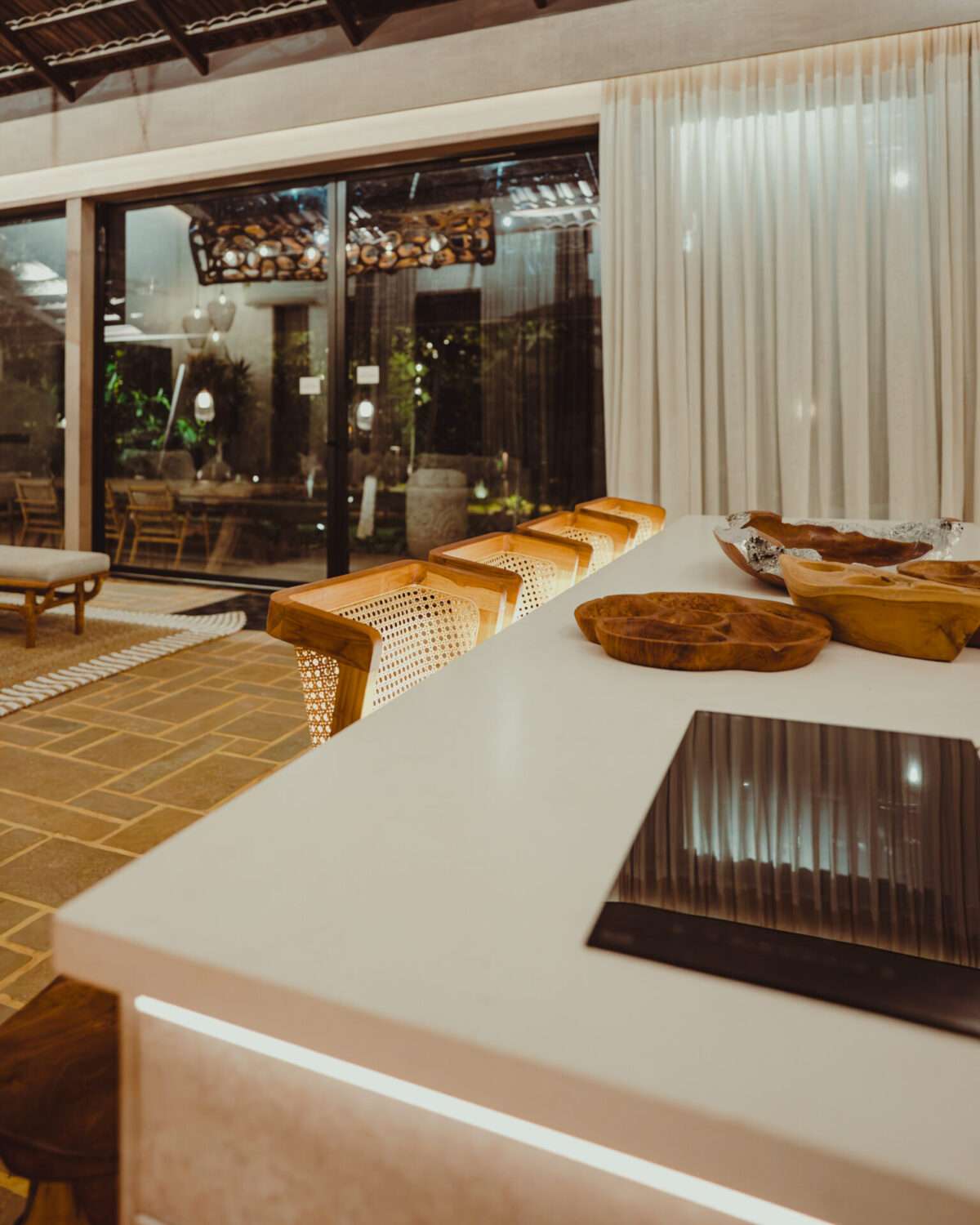 Elegant and grounded- modern meets artisanal in tone and texture | Modern kitchen with top-notch appliances | Fully equipped kitchen with top-notch appliances | Outdoor dishwasher area | Warm lights | Fan | Hanging cane lamps | Located on the ground floor