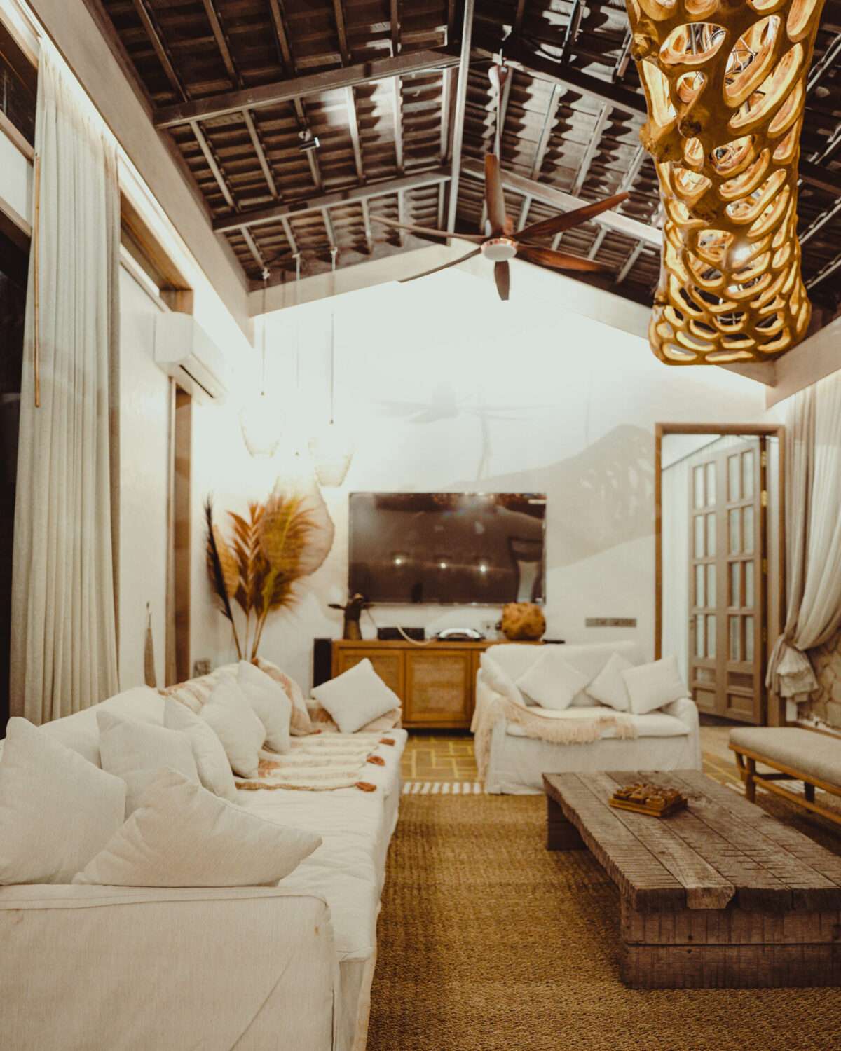 Area: 527.52 sq. ft. | White sofas with rounded edges, ottomans & a table | Wooden chairs | ACs | Ceiling Fans | TV 85″ | Unique sculptures & artwork | Lamp with a wicker shade | Wood-beamed ceiling | Classy chandelier & thatch pendant light | Exposed brick walls | Bohemian & coastal elements with rustic charm | Large wooden console | Music system/ Speakers | Outdoor patio with cosy seating | Large window with sheer curtains | Located on the ground floor | Powder room