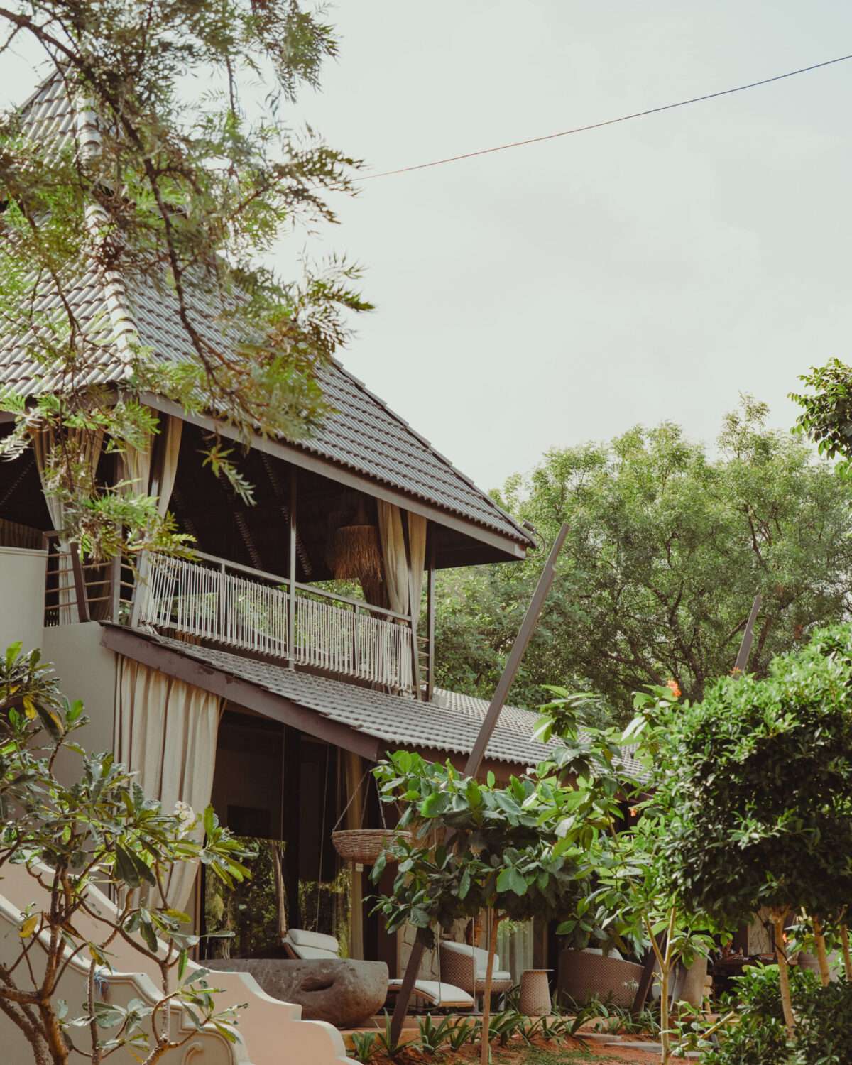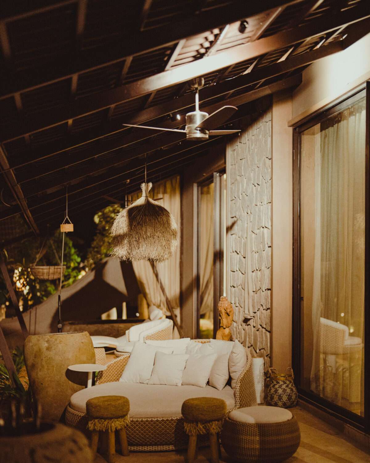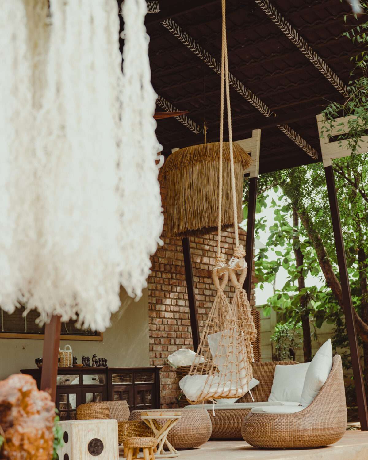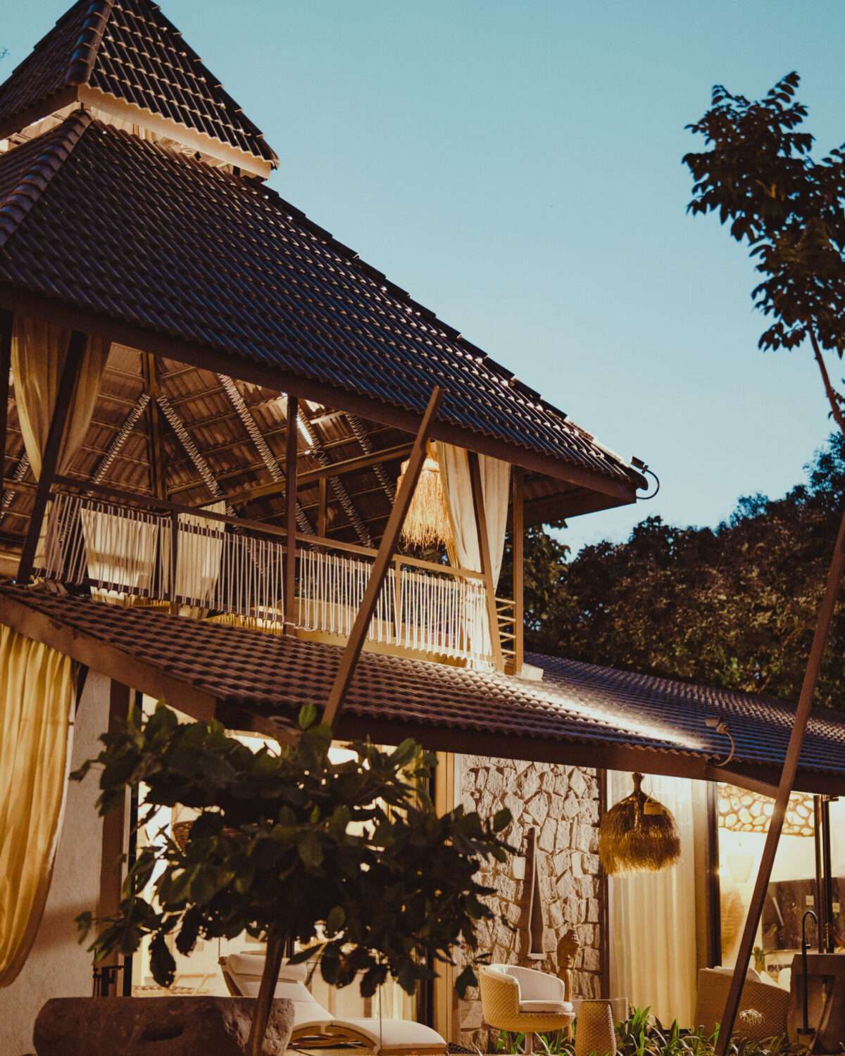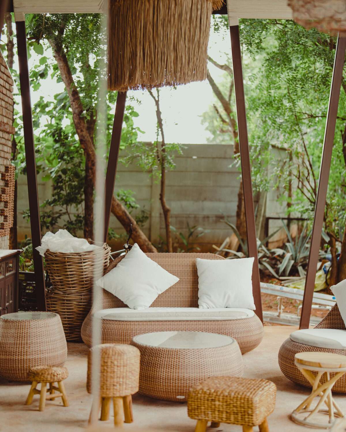 Outdoor patio setup | Wooden structure with a tiled roof | Wicker couch with white pillows | Wooden benches, chairs & a dining table | White lounge chair with cushions | Multiple sitting areas | Warm lights with boho-style hanging lamps | Forest view | Surrounded by lush greenery | Attic-style wood-beam ceiling | Bamboo daybed with curtains at the entrance | Surrounded by Palm trees | Large wicker basket | Potted plants