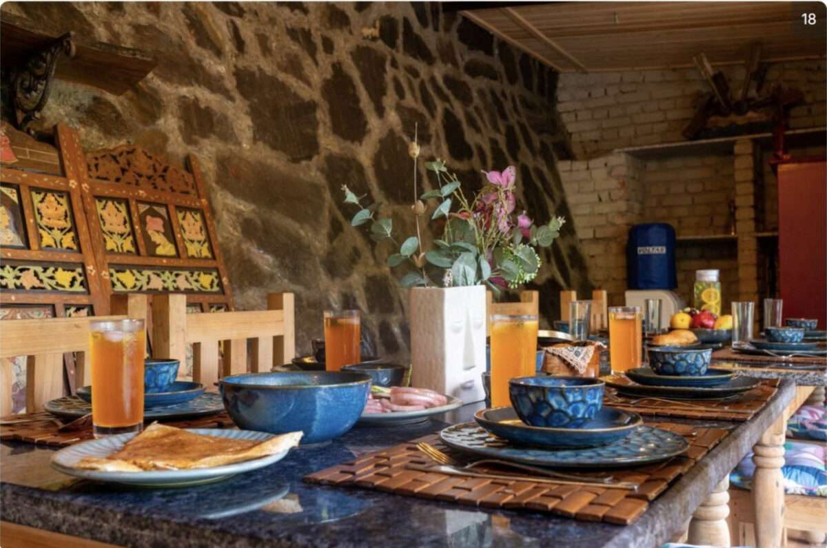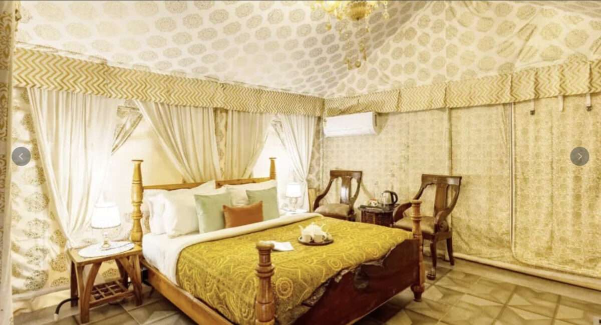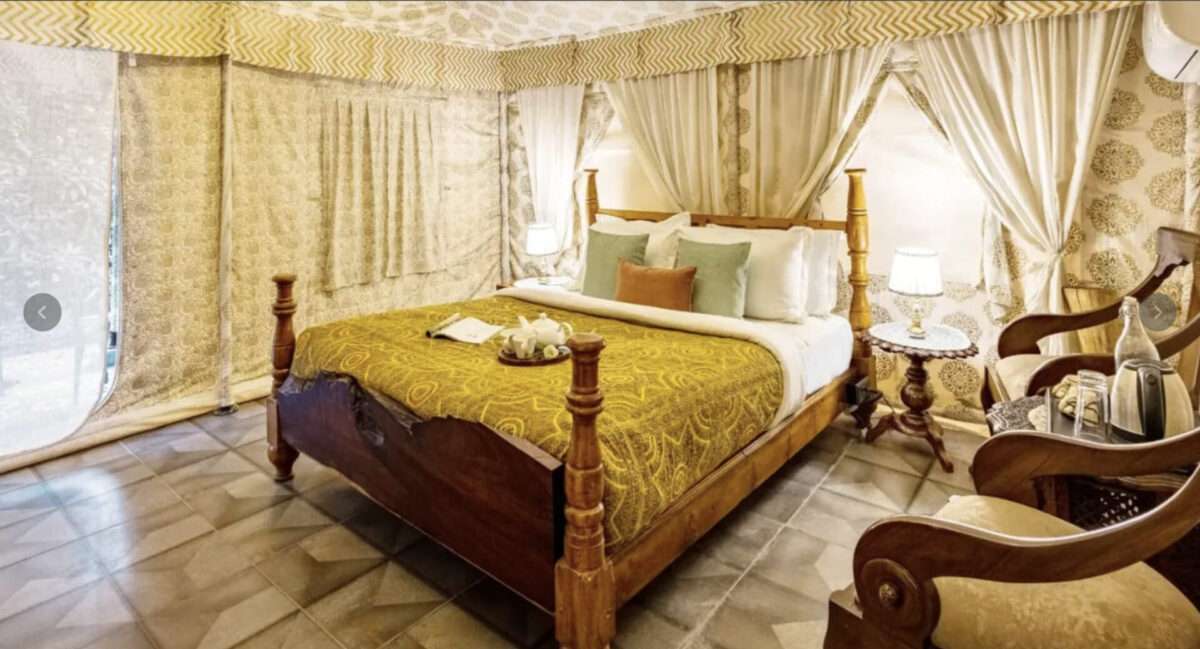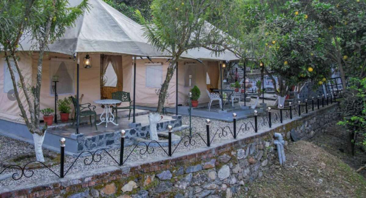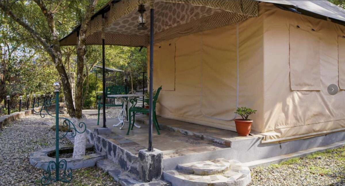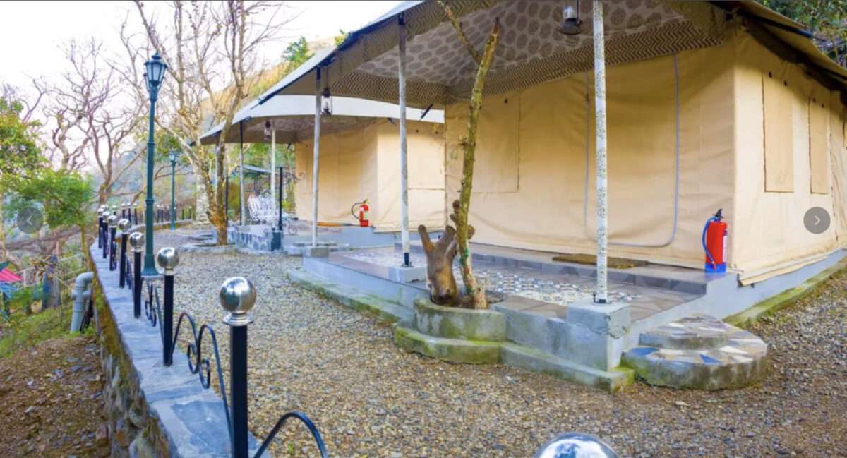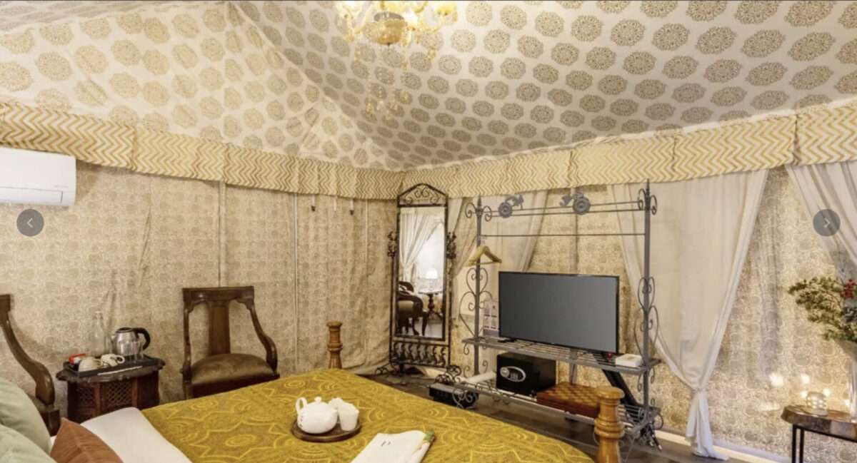 Tucked away within a serene resort, this luxurious tent offers the perfect escape for a memorable getaway in the hills! A charming chandelier adds a soft glow to the interiors, complementing the plush lounge chairs that promise absolute comfort. Modern amenities such as a TV, heater, air conditioning, and an ensuite bathroom ensure your stay is as comfortable as it is memorable. Step outside to the private patio, designed with cosy seating, perfect for enjoying the beauty of the hills.