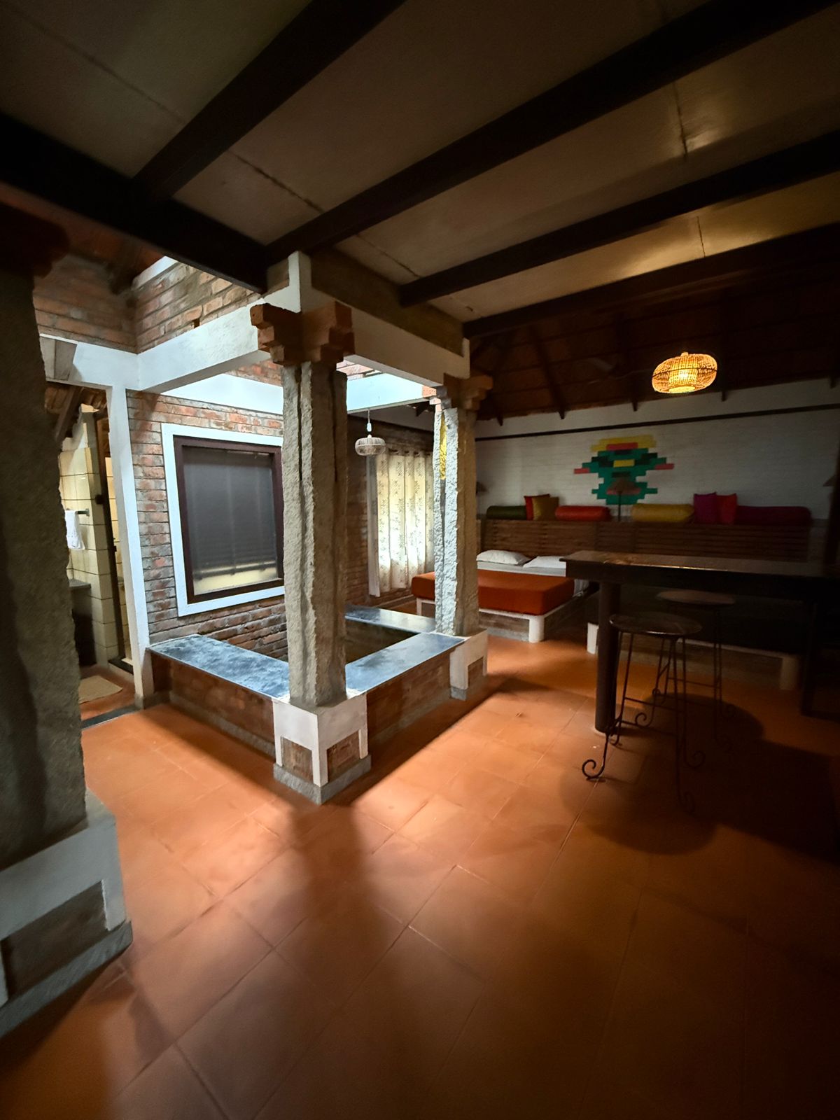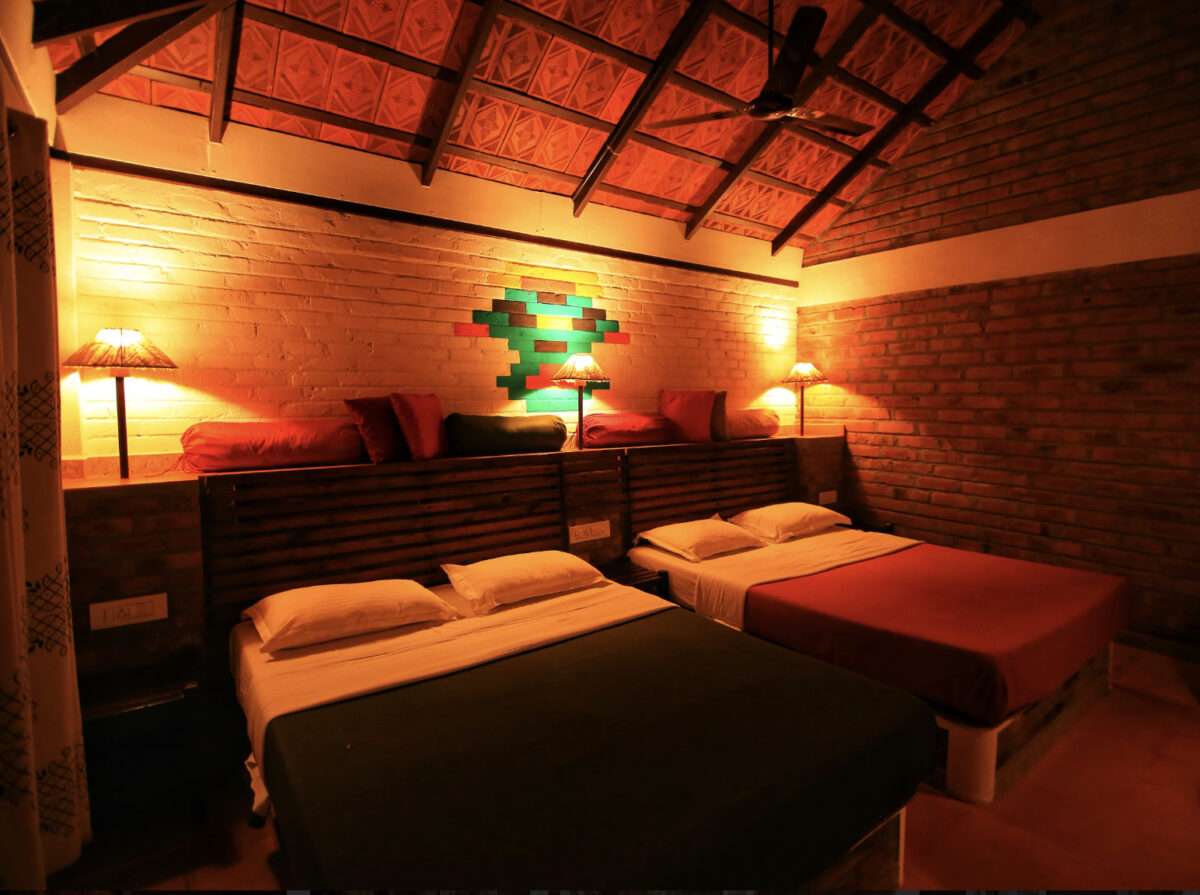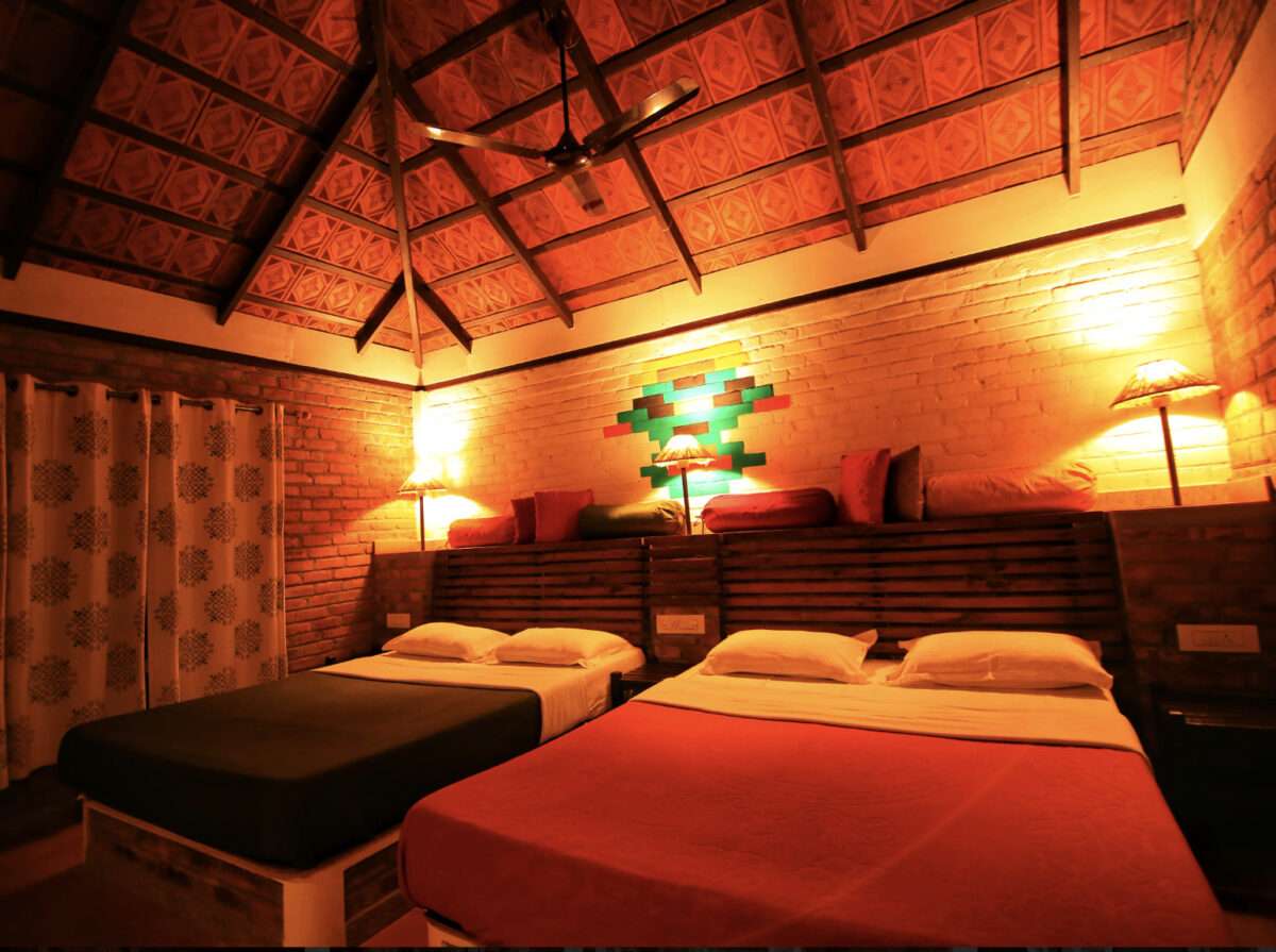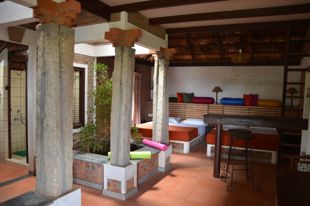 Suites are a world of their own, with their rustic brick architecture and sloping roofs. They comprise a living room, veranda, a closet, a washroom, and an attic. A queen bed is provided on the ground level and the attic has two single beds, making the suite perfect for a family with kids or a group of friends.